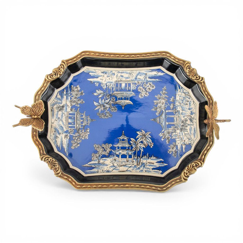 AZURE PAGODA blue porcelain tray with bronze ormolu dragonflies
