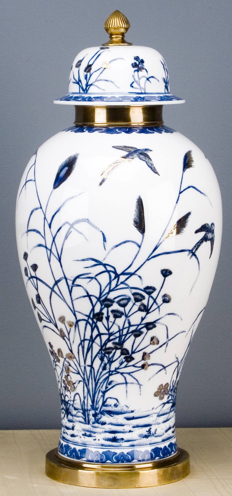 BLUE AND WHITE ORIENTAL GINGER JAR with bronze mounts and birds