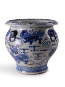 Reproduction porcelain fish bowl planter with blue and white foo dog design.