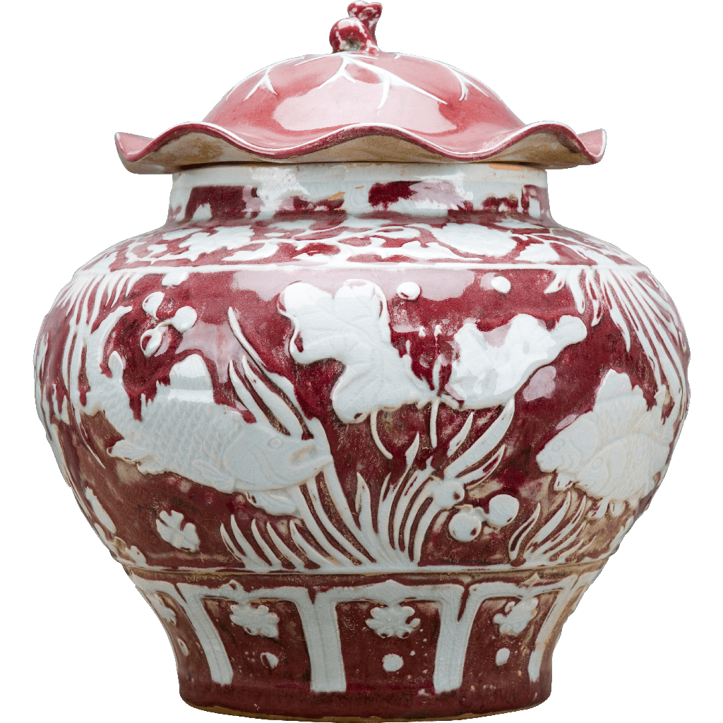 CHINESE POTTERY OXBLOOD AND WHITE AQUATIC MOTIF LIDDED JAR WITH FISH
