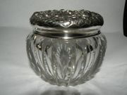 GORHAM STERLING REPOUSSE TOPPED DRESSER JAR WITH AMERICAN BRILLIANT CUT GLASS BOTTOM