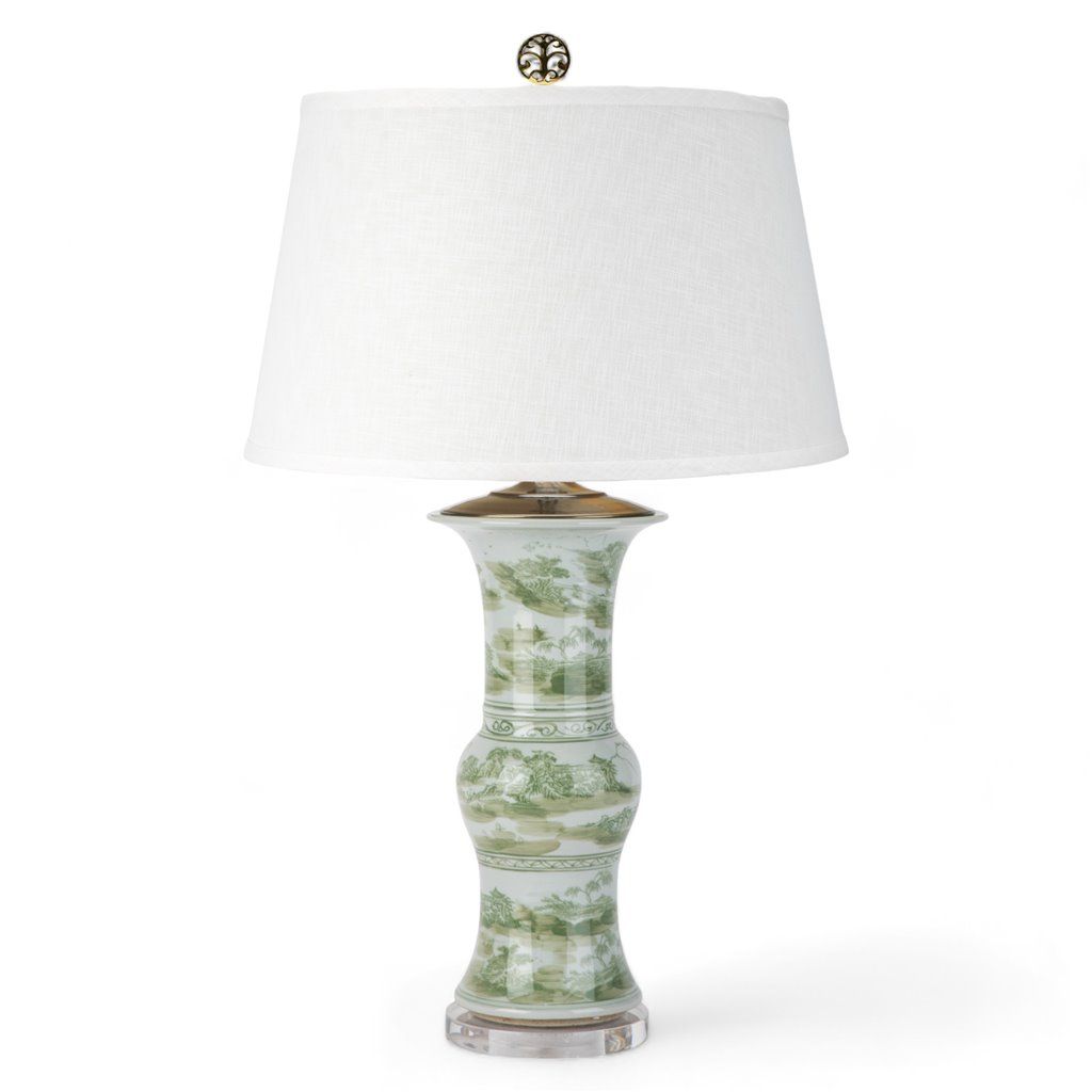 This Princess Mantel Vase Lamp features a classic green landscape scene hand painted in traditional Chinese style. The silhouette is elegant with a flared top and base balanced by a rounded center. It is mounted on a clear acrylic base and topped with a hard back linen shade that adds a crisp; tailored finish. Perfect as a statement lamp for living rooms or bedrooms. Measurements are 19 long 19 wide 31 high.