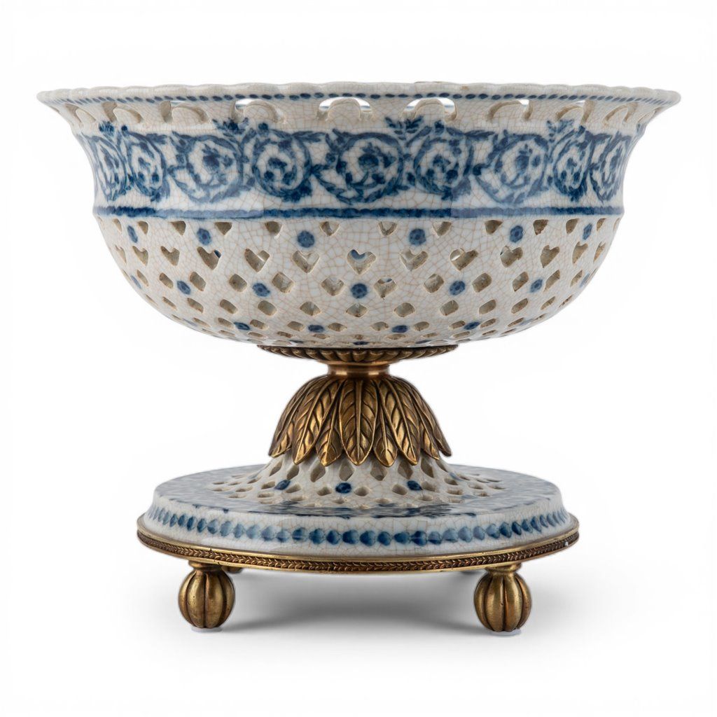 Porcelain and bronze ormolu BLUE SCROLL pierced fruit centerpiece bowl