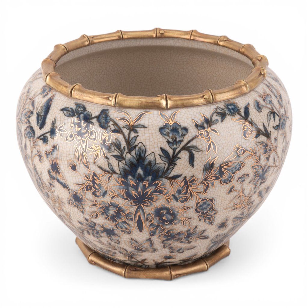 Porcelain and bronze ormolu Midnight Garden blue floral planter with bronze ormolu bamboo mounts.