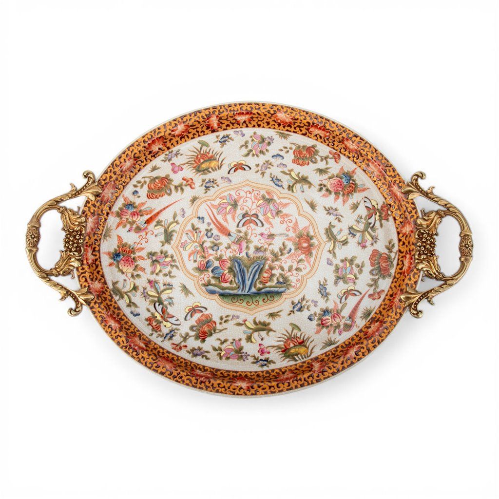 An oval porcelain serving tray decorated with colorful floral and oriental garden motifs. Finished with elegant bronze ormolu side handles, this piece blends functionality and decorative charm for serving or display on a tabletop or console.