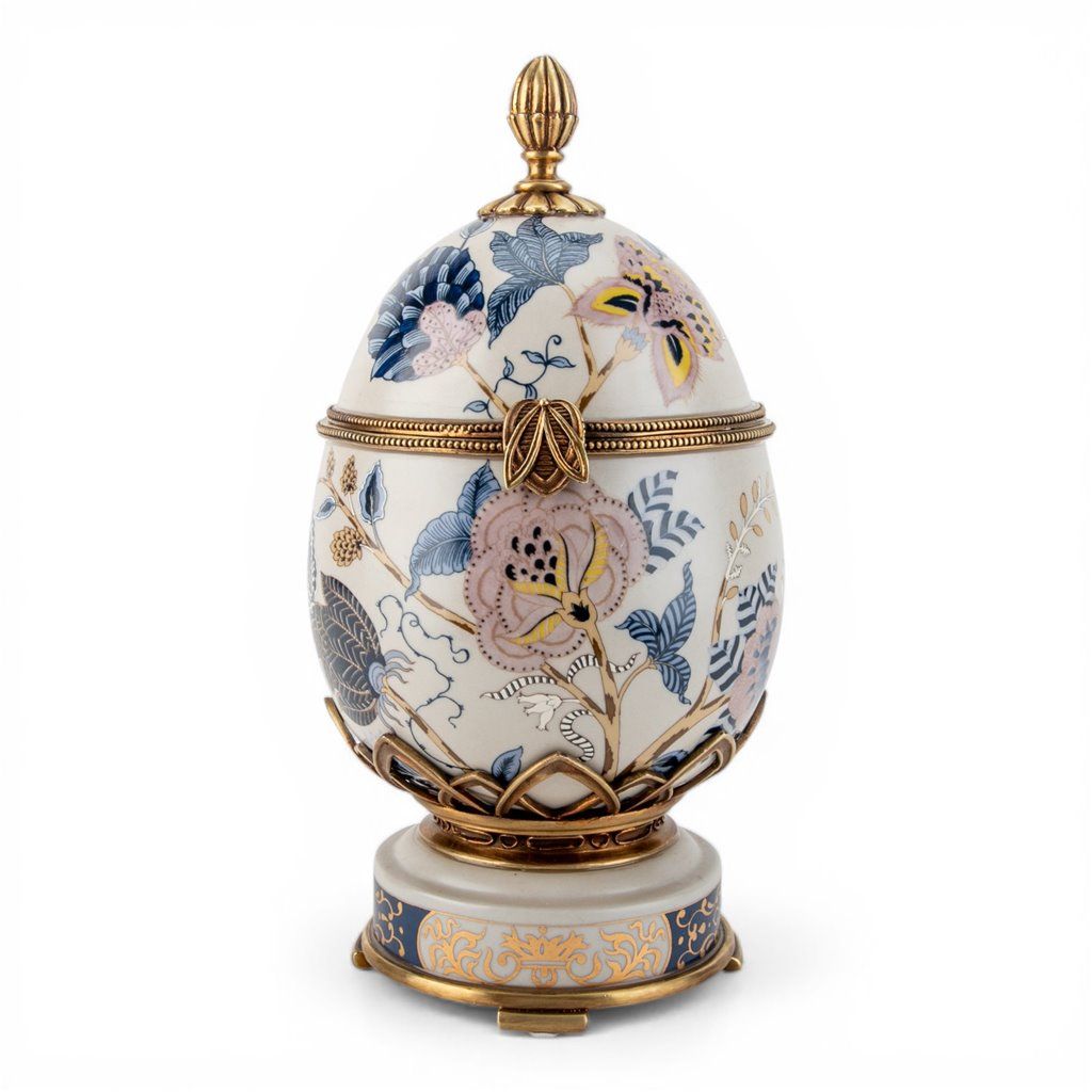 This Porcelain and bronze ormolu SILK BLOSSOM blue floral egg jewelry trinket box is a beautifully crafted collectible item inspired by Chinese culture. The intricate design features delicate porcelain blooms and elegant ormolu detailing, making it a stunning piece for storing small treasures or jewelry. The blue floral motif adds a touch of elegance, perfect for display in any home or collection.