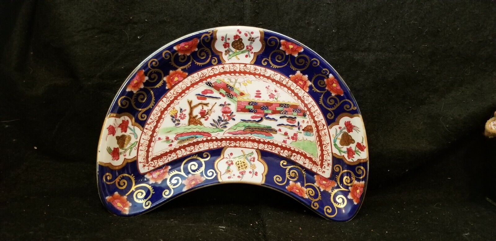 VINTAGE MASONS PATENT IRONSTONE CHINA LANDSCAPE IMARI CRESCENT PLATE D