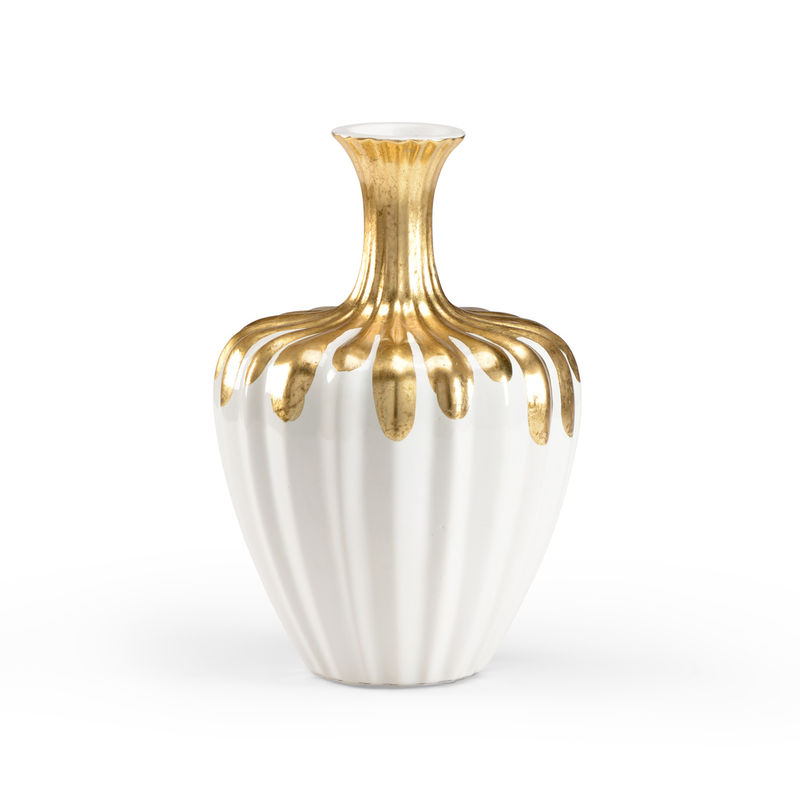 THE GOLD NECK BOTTLE VASE IS AN EXQUISITE ACCENT CAPABLE OF COMPLEMENTING ANY DECOR. THE FLUTED LONG NECK BOTTLE IS WHITE GLAZED CERAMIC WITH HAND DECORATED GOLD GLAZE ON THE NECK. THIS MODERN ACCENT PIECE IS AN IDEAL SIZE FOR A BEDROOM NIGHTSTAND, ENTRYWAY CONSOLE OR LIVING ROOM BOOKSHELF.